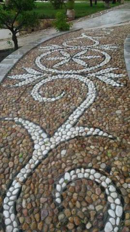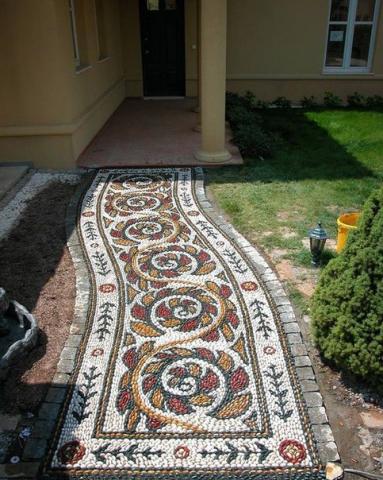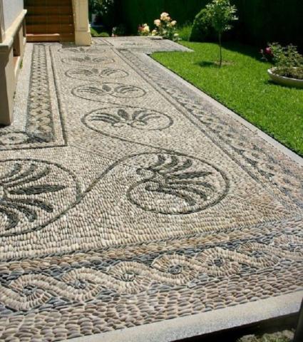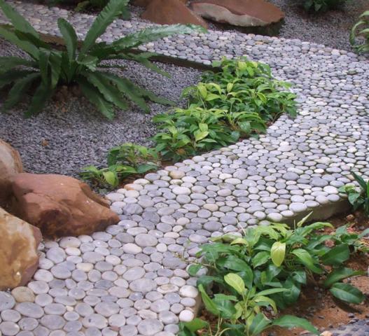 Дорожки из гальки. В настоящее время проблема выбора материала стала на самом деле сложной. Если раньше выбора практически не было, сейчас обычный потребитель сталкивается с изобилием вариантов. Для нерешительных выбор материала становится изнурительным и сложным испытанием. Сейчас дачники могут себе позволить отойти от тротуарной плитки, которая была принята последние десятилетия, и использовать для мощения садовых дорожек практически любой материал. Наиболее прочно в этой ниши осела галька. Описание материала. Широкое распространение среди дизайнеров и простых дачников галька получила благодаря своей оригинальности, неисчерпаемости, разнообразию. Впервые гальку использовали еще в Древнем Китае, именно тогда появился обычай помещать в сад камни круглой формы. Это объяснялось тем, что именно такие камни символизируют мужское и женское начало и их слияние. Стоит заметить, что дорожки из гальки полезны и для здоровья. Массаж, который получают стопы при такой ходьбе, оказывает общеукрепляющее действие не только на ноги, но и на весь организм. Галька удобна тем, что предоставляет возможность выкладывать различные узоры и орнаменты. Для истинного мастера такая возможность открывает горизонты по созданию нового вида искусства, которой и воспользовались ландшафтные мастера по всему миру. Помимо визуальной красоты и олицетворения мужского и женского начала, галька завоевала сердца людей своей практичностью и долговечностью. Дорожки из такого материала отлично впишутся и безупречно дополнят любую композицию дачи. Пошаговая инструкция создания. Дорожка из гальки своими руками будет гордостью любого дачника. Осталась самая малость — узнать последовательность работ и приступать к выполнению задуманного. В первую очередь, нужно определить форму дорожки. Недостаточно провести линии у себя в голове — требуется обозначить будущую конструкцию колышками, вбитыми в землю. Ориентируясь на эти колышки, которые, для верности, можно соединить шнуром или нитью, нужно выкопать траншею, глубиной тридцать-сорок сантиметров. Дно траншеи выравнивается при помощи песка. Этот слой может занять до десяти сантиметров. Поверх песка нужно насыпать мелкофракционный щебень. Вдоль краев дорожки нужны бордюрные камни. Для того, чтобы конструкция смотрелась аккуратно, необходимо выровнять их. В этом нелегком деле поможет строительный уровень. Дно траншеи заливается бетоном. Последнему нужно несколько дней на то чтобы застыть. Пока застывает бетон, можно заняться разработкой узоров, если это не было сделано раньше. Разрабатывать узоры можно при помощи карандаша и листа бумаги или компьютера, но суть остается прежней: создается схема расположения рисунков дорожек. Учитывается размер камней и их цвет. Это чисто творческая работа, поэтому можно выделить на нее вечер. Здесь человека останавливает только его фантазия. Сама мозаика должна быть выше уровня почвы. Это необходимо для того чтобы свести к минимуму вероятность того что вода затечет внутрь узора и останется там. Влага негативно влияет на любую конструкцию, даже каменную. Она может способствовать распространению грибка или вредителей внутри мозаики. Для того чтобы конструкция не копила в себе неприятную фауну и флору, нужно провести ряд мероприятий. В первую очередь, это многослойно