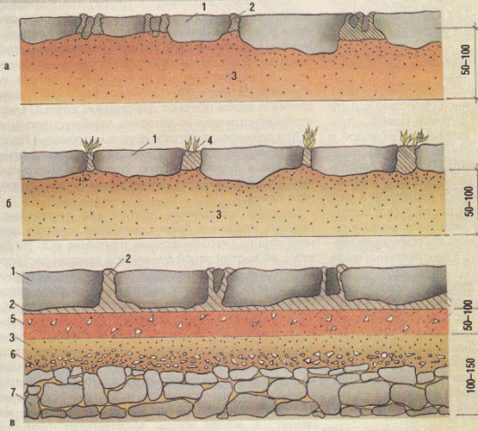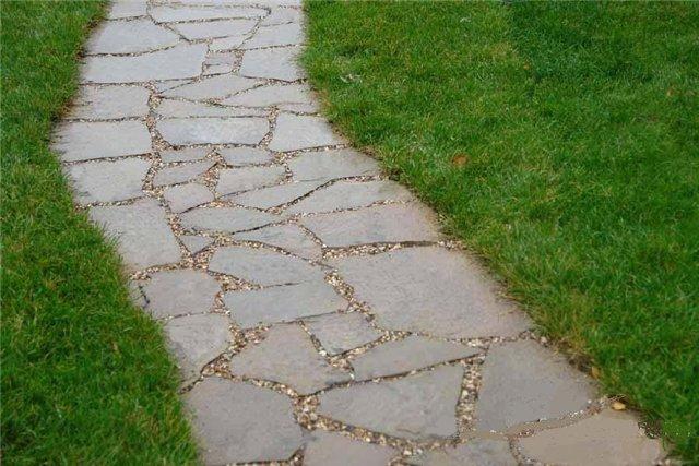 Как правильно сделать дорожку из природного камня. Большая часть застройщиков, в строительстве садовых дорожек на загородных участках, при создании ландшафтного дизайна, отдает предпочтение натуральным материалам. В этих случаях лучшей альтернативы, чем использование натурального, природного камня, нет. При создании ландшафтного дизайна на загородном участке, большая часть застройщиков отдает предпочтение устройству садовых дорожек с использованием натуральных материалов. Он обладает природной красотой, естественностью и высокими прочностными характеристиками. Природная красота, высокие прочностные характеристики и естественность – это основные достоинства этого материала. При укладке садовой дорожки используются различные материалы, например, плоский природный камень или дикий природный камень-плитняк. Такой натуральный материал, если все правильно сделать, отличается надежностью, качеством и долговечностью. Перечень необходимых материалов и инструментов. В строительстве садовой дорожки из камня применяются такие материалы: песок; цемент; щебень; специальный клей для камней; отсев. Инструменты для укладки природного камня: лопата; киянка; болгарка; мастерок; строительный уровень; шнур; щетка. Перечень необходимых инструментов: лопата; киянка; бетономешалка; болгарка; мастерок; жесткая кисть для специального клея; специальный мастерок для приклеивания камня; отрезные круги для камня; строительный уровень. Садовые дорожки из плоского природного камня. Для определения размеров садовой дорожки возьмите четыре деревянных колышка и обозначьте ими две боковые стороны. Натяните веревку и через каждые полтора метра забивайте деревянные колышки необходимые для дальнейшего крепления направляющих. Строительство дорожки в этом случае включает в себя два этапа. Первый этап – это обозначение контура будущей дорожки. Ее извилистость и форма определяются только вкусовыми пристрастиями и фантазией хозяев загородного участка. Затем, с помощью лопат, точно по контуру отрывается канава. Ее глубина должна быть не меньше длины, равной металлической части штыковой лопаты. После удаления дерна, по всей длине канавы засыпается слой крупного материала. Это может быть щебень, галька, шлак или кирпичный бой. Любой используемый материал обязательно утрамбовывается. Затем по всей длине канавы засыпается слой песка, который, в свою очередь, также утрамбовывается с обязательным применением воды. Второй этап – это непосредственная укладка садовой дорожки, которая может состоять из двух вариантов. Первый – плоский природный камень выкладывают на песок. Этот вариант значительно проще, как по финансовым и временным затратам, так и по трудоемкости процесса. Второй вариант – природный камень укладывается на бетонный раствор. Этот вариант дороже и труднее, но он значительно надежнее. Конструкция дорожек, с покрытием из природных камней, швы между которыми заполнены раствором (а), растительным грунтом с посеянной травой (б) и дороги для проезда автотранспорта (в): 1 – природный камень; 2 – раствор; 3 – песок; 4 – растительный грунт; 5 – монолитный бетон; 6 – щебень; 7 – бутовый камень. Если застройщики решили использовать первый вариант, то при укладке на песок необходимо посильнее прижимать его, для этого иногда используют резиновую к