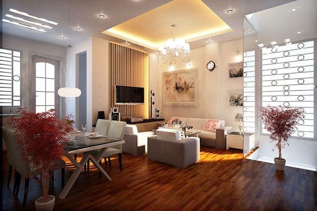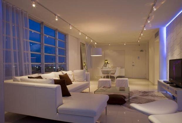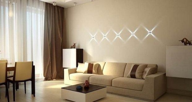 Советы для реализации освещения в гостиной. Освещение гостиной: фото примеры основной, локальной, точечной, интеллектуальной подсветки. Рекомендации – как правильно спланировать освещение в гостиной. Гостиная в каждом доме выполняет сразу несколько функций. В ней могут принимать гостей, смотреть телевизор, общаться, читать. Это главная причина, по которой важно сделать освещение в этой комнате многофункциональным. Также важна правильная расположенность выключателей и каждой розетки. Основное освещение. В большинстве случаев общее освещение в гостиной используют тогда, когда основной частью помещения является место для гостей. Для этого необходима люстра, одноламповые подвесные светильники и плафоны. В соответствии с размерами комнаты важно подобрать светильник для потолка. При этом учитывают интерьер и свой вкус. Основное внимание при размещении необходимо уделить геометрическому центру потолка. В некоторых случаях светильник устанавливают прямо над столом для приема пищи. Наиболее популярными сейчас стали люстры в стиле классики. Они очень разнообразны в связи с появлением технических новшеств. К примеру, в некоторых из них есть крепления для плафона, чтоб изменять направление светового потока. Локальное. Чтобы было проще выделить некоторые детали интерьера и выполнить световое зонирование, применяют локальное освещение в гостиной. Здесь не подойдут больше светильники для потолка. Зона отдыха должна быть обустроена локальным освещением. Ведь здесь чаще всего читают книги, общаются в семейном кругу и проводят вечера. Для максимального комфорта, необходимо выбрать удачное местное освещение. Чтобы в зоне отдыха было приятно сидеть, необходим торшер, настольная лампа или бра. Мягкий и приглушенный свет лучше направить на то место, где стоит телевизор. Если в комнате есть камин, то лучше использовать утонченные настольные лампы. Также подойдут и светильники, выполненные из бронзового материала и обладающие формой подсвечника. Точечное. Чтобы картина, оригинальная статуэтка и другие предметы искусства не остались незамеченными используют точечное освещение гостиной, которое подчеркнет их красоту. Также точечный свет может играть роль дополнительного освещения. Одной из разновидностей точечного осветительного прибора является спот. Его конструкция может вместить в себе либо один, либо несколько светильников. В них предусмотрено вращение в заданном направлении, а это позволяет выгодно подчеркнуть один из фрагментов интерьера. К точечным можно отнести и разновидность светильников направленного света. Ими можно прекрасно осветить предметы и те места, где ограничено пространство. Интеллектуальное. Если в гостиной есть много источников света, то это приведет к определенным неудобствам. Ведь ими трудно управлять. Эта проблема решается благодаря системам интеллектуального освещения. С помощью данной системы легче контролировать все осветительные приборы одновременно. Для этого используется пульт управления, который можно вмонтировать в стену или приобрести переносным. Такое «умное» освещение имеет функцию реакции на появление человека. При этом сразу же загорается свет. К тому же самому можно установить необходимую яркость. Через 4 минуты после включения этот прибор отключается сам по себе, если нет дв