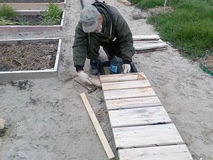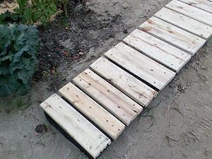 Садовые дорожки с минимальными затратами. Как известно, такой строительный материал как кирпич, поступает на стройки в специальной таре — европоддонах, выполненных из деревянной доски и брусков. Для этих целей используется дерево различных пород: берёза, осина, сосна. Дерево, конечно, не самого высокого сорта, но вполне хорошего качества. Так вот, эти самые европоддоны на стройплощадке (практически на любой) можно взять абсолютно бесплатно, ваши расходы составят только затраты на доставку до дачи или садового участка. Если же у вас есть в наличии грузовое транспортное средство, то и эти расходы исключаются. Изготовление садовых дорожек из европоддонов своими руками. Если у вас проблема свободного времени стоит очень остро, то дорожку можно сделать и непосредственно из европоддонов, просто укладывая их один за другим в нужном вам направлении. Но эстетическая ценность такой садовой дорожки будет невысока, да и гвозди в этой таре вбиты не особенно аккуратно. Лучший вариант — разобрать европоддоны на составляющие, то бишь, на доски и бруски, убрать гвоздодёром гвозди и зачистить доски электрорубанком. В процессе работы вам могут потребоваться следующие инструменты и материалы: молоток; гвоздодёр; ножовка; стамеска; угольник; рулетка; электропила циркулярная; электрорубанок; гвозди; битумная мастика; краска; кисть. Стандартные размеры европоддонов составляют 800×1200×145 мм или 1000×1200×145 мм. Тара состоит из досок разной ширины (узкие и широкие), которые чередуются. Размер досок вполне подходит для создания дорожки на даче или в саду, так как садовые дорожки редко превышают ширину в один метр. Даже 500 мм — ширина достаточная для свободного перемещения по дорожке человека или даже садовой тачки. Настил дорожек нужно выполнять по лагам, в качестве которых можно использовать деревянный брус, распиленные пополам доски — пятидесятки или металл (к примеру, труба небольшого сечения). Через каждые 500-600 мм в деревянные лаги врезают поперечный брусок, выполнив предварительно запилы. Готовое основание для настила досок необходимо покрыть защитным средством, например, битумной мастикой. Обработанная древесина меньше поддаётся негативному природному воздействию, и срок службы ваших садовых дорожек будет более продолжительным. Прежде чем прибивать доски, с нижней стороны их также необходимо обработать той же мастикой или иным средством, имеющимся у вас в наличии. После того, как мастика подсохнет, можно прибивать доски, оставляя между ними небольшой зазор (сантиметра 2), для стока воды. Чтобы не вымерять постоянно расстояние, можно воспользоваться небольшими отрезками доски, толщина которых составляет 2 см. И, при укладке каждой последующей доски, вставлять между досками эти дощечки. Вбивая гвозди, не забудьте поглубже утопить шляпки гвоздей, чтобы случайно не поранить ногу, так как по деревянным дорожкам замечательно ходить и босиком. Готовые дорожки для дачи можно покрасить любой атмосферостойкой краской для наружных работ.
